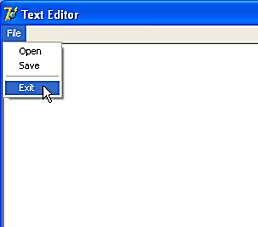 procedure TForm1.mnuExitClick(Sender: TObject); begin Close; end; Don't believe it can be that simple? Try it and see! Now that we've seen how the OnClick event works for the Exit Menu item, we can move on and write the code for the OnClick events for the Open and Save items.