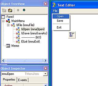 Display mnuOpen in the Object Inspector by clicking on it in the Object TreeView or by selecting it in the Object Inspector's DropDown List. As with mnuExit select the Events Tab and double-click the empty box alongside the OnClick event in order to create the skeleton procedure: