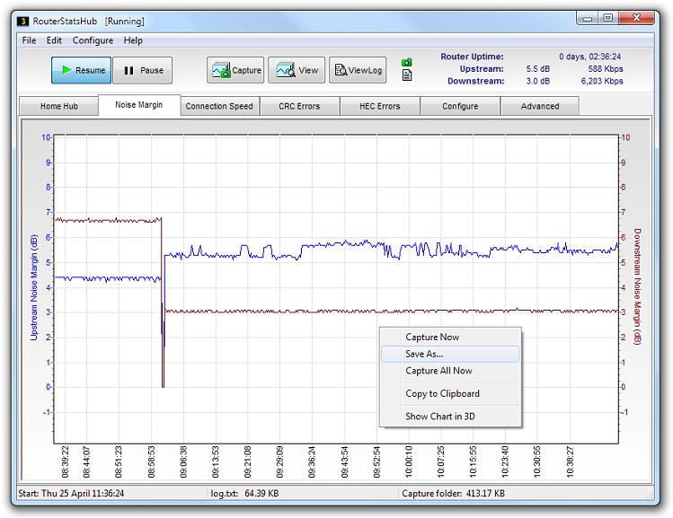 RouterStatsHub is able to monitor, and plot on graphs, upstream and downstream statistics associated with an ADSL telephone line. Simple adjustments to, for example, the location of the Hub's power supply brick can make a marked difference to these statistics and RouterStatsHub makes it simple to monitor the effect of any changes you make.