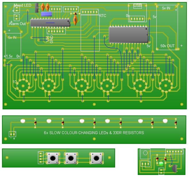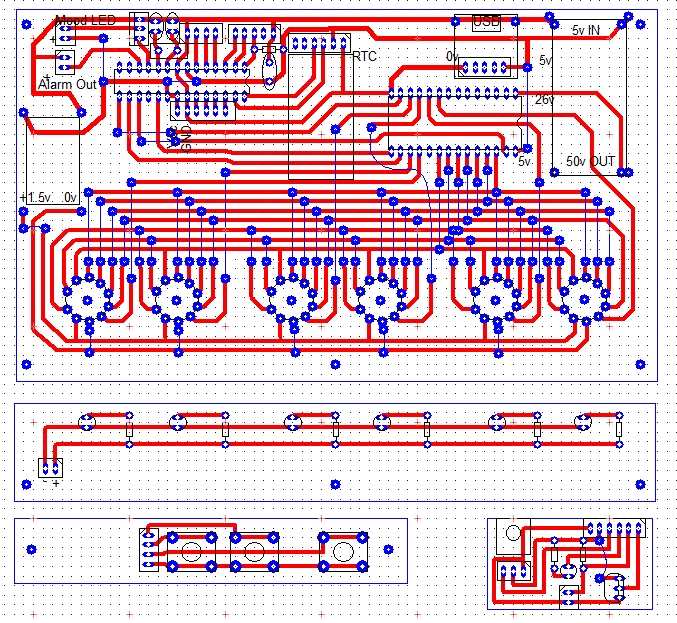 Printed Circuit BoardsNOTE: Although the IV-12 datasheet shows them as having a diameter of 22.5mm, the tubes I received are only 21.5mm. The PCB layout is based on the smaller diameter. You may need to alter the tube spacing slightly if your tubes are, in fact, 22.5mm.