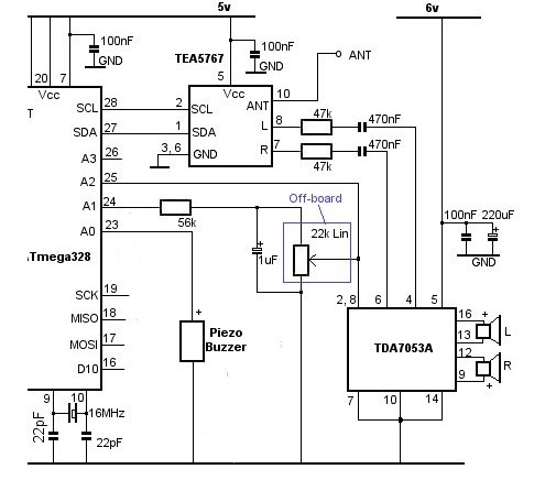 ![]() Arduino pin A1 is used as a digital output to supply 5 volts to the TDA7053A's DC volume control on pins 2 and 8. The potential divider formed by the 56k resistor and the 22k potentiometer means there's a maximum of 1.4 volts at the "hot" end of the 22k potentiometer. The TDA7053A datasheet states that any voltage of 1.4 volts and above on pins 2 and 8 results in maximum gain. Taking digital output A1 LOW is used to mute the amplifier. According to the TDA7053A datasheet, any voltage below 0.47v will mute the output. When the Arduino software detects a match between the actual time and the alarm-time setting, pin A1 is taken HIGH thus un-muting the audio. Arduino pin A2 is used as an analogue input to measure the actual setting of the volume control. If the volume is set too low, Arduino pin A0 (configured as a digital output) will go HIGH sounding a piezo buzzer as well. Ideally, the input to A2 would measure the actual volume (rather than just the setting of the volume control) but, as the TDA7053A uses balanced speaker outputs (ie neither side of the speaker is connected to ground), it's not sensible to measure the volume this way. Most radio stations - particularly those that would be suitable as a wake-up alarm - tend to have fairly consistently-high volume levels anyway so this shouldn't be a problem. Also, because neither side of the speaker is grounded, it's not possible to connect the digital output A0 to the speaker so a separate piezo buzzer has to be used. I provided the TDA7053A with its own 6v power supply. I noticed that the audio tended to distort at higher volume levels when supplied with 5 volts and, in any event, I wanted to keep the potentially noisy Arduino and Real Time Clock supplies separate from the audio amplifier supply. With nearly 40dB of gain, the audio amplifier could be susceptible to picking up noise fairly easily.