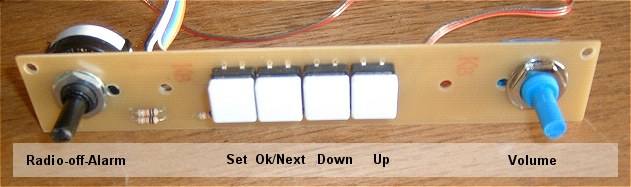 The Front Panel Switches![]() The front panel switches and volume control are fitted to a separate sub-panel which is attached to the front panel itself using stand-off hex pillars. The Radio-off-Alarm rotary switch and the four tactile buttons each have a 10k pull-down resistor to ground. The panel connects to the main PCB using an 8-way ribbon cable for the switches (plus 5v and Ground) and a three-way cable for the volume control potentiometer. The main PCB end of the ribbon cables terminate in header plugs. I've provided an additional 2-way header on the main PCB for connecting a second Ok/Next button in parallel with the first. This button simply duplicates the button on the front panel but is situated on top of the case where it's more convenient to use as the "Sleep" and "Snooze" button.