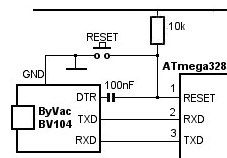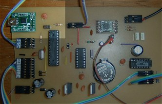 This photo shows (highlighted) the programming section on the final PCB. It's a matter of personal preference whether to include the full-blown USB-to-RS232 hardware, as I have done here, use nothing at all and rely on programming the ATmega328 externally before plugging it into its socket in the alarm clock or to go for something in between! For example, the USB-RS232 breakout board I used here could be external to the clock, in which case just pins 1, 2 and 3 of the ATmega328 (plus ground and possibly 5v) would need to be accessible...... Very much a case of "you pays your money and takes your choice" ! But, whichever way you do it, the ATmega328 reset pin (pin 1) needs to be pulled to 5 volts through a 10k resistor to prevent it spontaneously resetting itself.