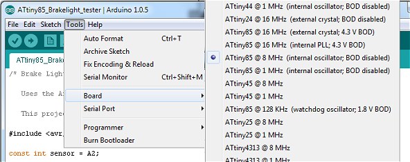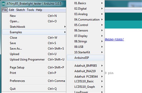 Programming the ATtiny85The ATtiny85 is programmed using the Arduino environment with either an Arduino Uno or a dedicated programmer.It's necessary to define the ATtiny85 core so the Arduino IDE knows about its pins. Be aware there are a couple of different libraries for the ATtiny85 that treat the ATting85's internal registers differently. The library I used in the Arduino brakelight Sketch is arduino-tiny. The 'README' included in the downloaded zip package contains full instructions for installing it into the Arduino IDE. There are dozens of websites detailing how to use the Arduino Uno as a programmer - particularly for the ATtiny85 - so I won't repeat them in detail here. In brief, the steps are: