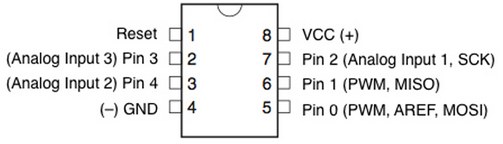 If you want to try some of the simpe Arduino examples before you program the ATtiny85 with the brakelights sketch (for example, the Blink example), remember that the pinout on the ATtiny85 is completely different from the ATmega328 used in the Uno.