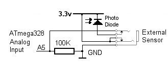 The photodiode is connected to the ATmega328 via a normally closed contact on the 'tip' connection of a second 3.5mm stereo socket. Inserting a plug will disconnect the photodiode and route the ATmega328 input to the outside world. Here, it could be connected to a more sensitive light sensor or a microphone, for example. The 'ring' connection on the 3.5mm socket provides 3.3 volts to the outside to