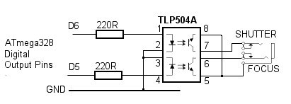 I've used a TLP504A opto-isolator. It has two channels in an 8-pin DIP package so is ideal for controlling both focus and shutter. I've connected the outputs from the opto-isolator to a standard 3.5mm stereo socket such that the camera's focus connection is to the stereo plug's 'ring' contact, the shutter connection is to the plug's tip and the common is the the plug's 'sleeve' connection. Note that none of the socket's contacts are connected to the project Ground. The Controller's software has an adjustable time delay between activation of the focus and shutter opto-isolators.