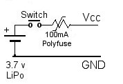 Power SupplyThe Nokia 5110 is a 3.3v device so some thought was given to the type of power supply.The ATmega328 will run happily at 3.3v so, rather than mess around with voltage level converters, it makes sense to run the whole circuit at 3.3v. This means that an external programmer connected to ATmega328 pins 1, 2 and 3 absolutely must NOT supply 5v to our circuit unless the Nokia 5110 display is removed and the internal battery disconnected. I've designed the PCB, so that what would be the 5v input to the programming header from the programmer is deliberately left unconnected. Our project obviously has to be portable, ie battery powered, and the simplest option is to use a CR2032 button cell. The problem is these cells are only 3 volts (which is just about ok) but they quickly lose their initial voltage. I've designed a simple PCB to use with a CR2032 holder. I've had no experience with rechargeable Lithium Polymer batteries but this project seemed a good opportunity to try one out - especially as small size was a major consideration for this project. I settled for this 110mAh battery which has internal circuitry to protect itself from reasonable abuse. Even so, despite the battery's in-built protection, I've also included a 100mA resettable fuse (polyfuse) in the circuit. Even a tiny 110mAh LiPo battery could deliver a LOT of current in the event of a fault somewhere in the project. At 3.7 volts (nominal) it would probably be just about safe to connect it directly to the Nokia 5110 except the lithium polymer's fully charged voltage is 4.2 volts which I consider a bit too high for comfort. As a result, I've included a 3.3v very low drop-out regulator. It requires a 0.2 volt differential so should give a reasonable "range" of usable voltage from the LiPo. When the Controller is operating in modes which don't require the photodiode to be "poised for action" continuously, I've arranged the software to put the ATmega328 in Power-Down mode which reduces the current consumption dramatically - from around 8mA down to about 1.5µA -- yes microamps! Unfortunately, one consequence of using the 3v3 regulator is that the regulator itself requires current, resulting in a Power-Down current of around 0.5mA. Obviously not as good but still a worthwhile saving. It has been pointed out on the Arduino forum that the MCP1702-3302E/TO would be a better choice for the regulator because its standby (quiescent) current is only around 2uA. It would need a slight re-design of the power supply PCB because the regulator's pinout is different but I didn't get around to this.... see "Update"...