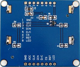 Graphical 84x48 LCDThe device uses an inexpensive and commonly available graphical 84x48 LCD - the Nokia 5110. It comes mounted on a small breakout board with an 8-pin header but, unfortunately, I'm aware of at least three different pinout arrangements which makes designing a "universal" PCB difficult if not impossible.