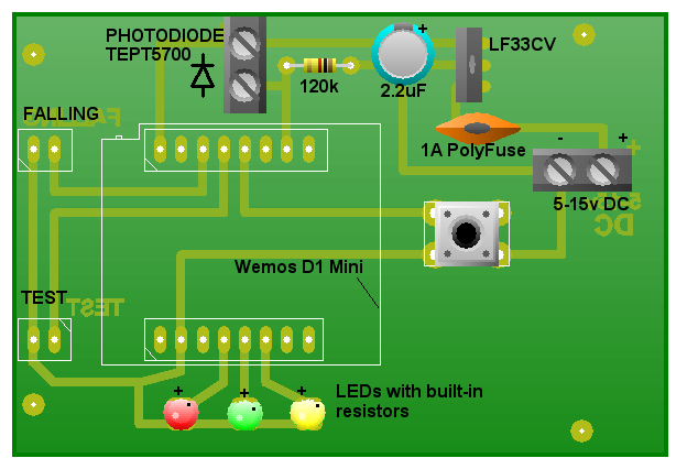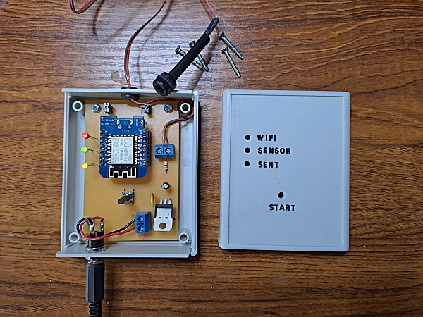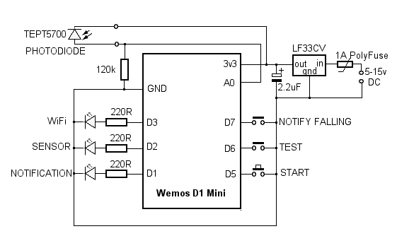 When the unit is powered up, it attempts to connect to your router. The WiFi LED on output pin D3 will begin to flash once the connection is established. The unit is now in a waiting state while you attach the photodiode sensor to the charger's LED. Once positioned, press the START button. The WiFi LED will now light solidly and the SENSOR LED will echo the Charger's LED. The Wemos D1 Mini requires a 3.3 volt supply so I used an LF33CV very low dropout votage regulator. It provides for some flexibility in the power supply. Logically, the battery charger and the battery will be located close to each other so the power for the Charger-Alert can come from the battery being charged but it should run off a 5 volt lithium pack for some time if the battery isn't near the charger.