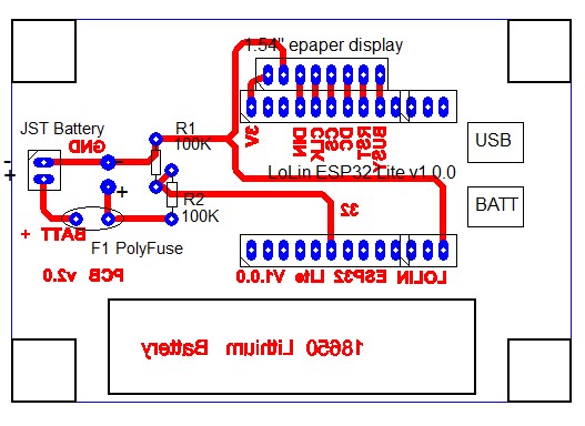 Waveshare 1.54" e-paper display. The PiHut WEMOS LOLIN32 ESP32 Lite V1.0.0. eBay: DKJNA The simple circuit is built around a Wemos ESP32 LoLin32 Lite v1.0.0. It should work equally well with other ESP32 modules but, so far, I've not been successful in getting the e-paper display to work with an ESP8266. The ESP32 is extremely low power when it's in sleep mode so is probably better-suited than the ESP8266 anyway - especially considering there's very little difference in the price these days. The Waveshare 1.54" e-papaer display automatically goes into very low power mode when it's not being refreshed so the entire project should last for months before the battery needs re-charging. Some LoLin ESP32 modules provide access to the battery voltage and even have a dedicated GPIO Pin but, as there's no access to the actual battery connection on the LoLin32 Lite v1.0.0 module, it's not possible to monitor the battery voltage directly from the module. On the PCB layout, below, the 18650 battery plugs into a separate PH2 JST connector. From there, two 100k resistors form a potential divider across the battery with their junction connecting to the LoLin32 modules GPIO Pin 32 in order to monitor the battery voltage. A short jumper lead connects the full 18650 battery voltage to the PH2 connector on the LoLin32 module to make use of the module's on-board low drop-out voltage regulator and to enable the module's built-in charger to charge the battery.