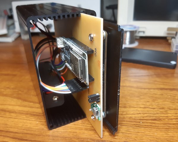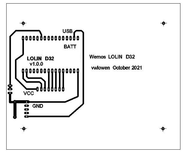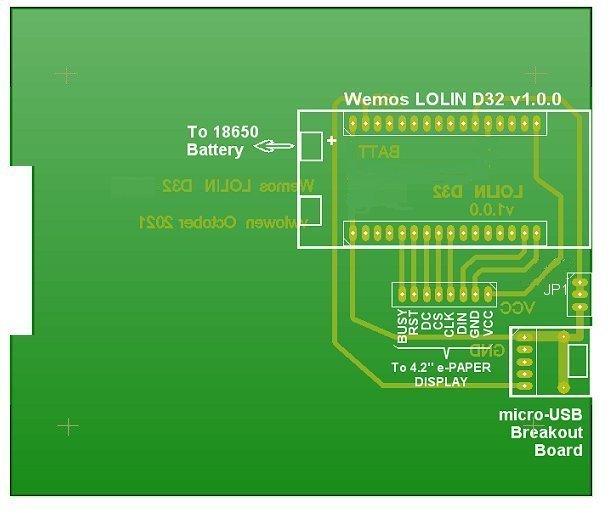 Printed Circuit BoardThe circuit is so simple, it hardly justifies making a PCB but it does help to fit the display in an enclosure by attaching the display to the PCB which is sized to exactly fit the enclosure's internal slots.As I'm using a metal enclosure with plastic ends, the Wemos LOLIN D32 module is positioned to keep its antenna as close to the "outside world" as possible. Power to the module to charge the battery is through a separate micro USB socket. The USB socket on the module will only be used if/when the sketch needs re-programming. The PCB layout is only for the particular header pinout arrangement of the Wemos LOLIN D32 v1.0.0 module.
