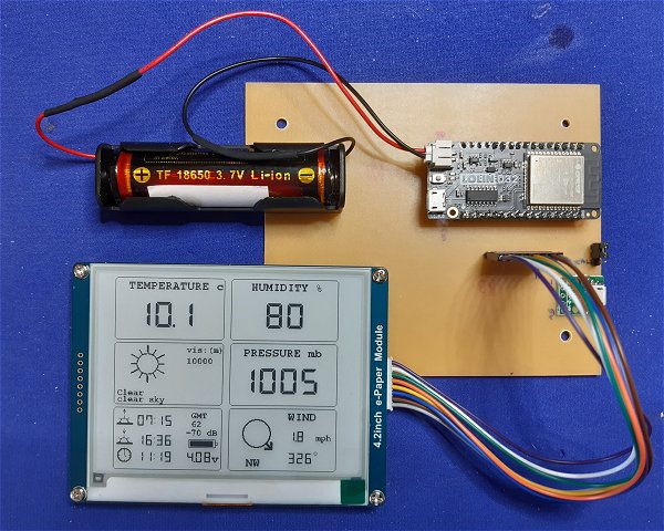 As e-paper continues to display its image even after its power supply is removed, it seems like a good choice for a project which spends most of its time powered down, asleep. This weather monitor obtains its data from a publicly-accessible website: https://openweathermap.org, which is free to use (with some limitations). They only update the data for a given location every 10 minutes so there's little point in calling the server more frequently. As internet access is obviously a prerequisite for the project, either an ESP8266 or an ESP32 WiFi module is the logical choice. After a few failed attempts to get my e-paper display to work with an ESP8266 module [a LOLIN (Wemos) D1 mini pro], I opted to use a LOLIN D32. (Apparently, Wemos changed their name to LOLIN in an attempt to combat all the clones that are appearing on the market, so there is some interchangeability and confusion with the name). There are a few variations of the LOLIN/Wemos D32 module - some with a JST PH-2 battery connector and a 500mA 3.7v lithium charger/controller on-board. All of them will work with this project but I used the Wemos LOLIN D32 v1.0.0 module, mainly because it had a charge-controller and even an on-board voltage divider for measuring the battery voltage.