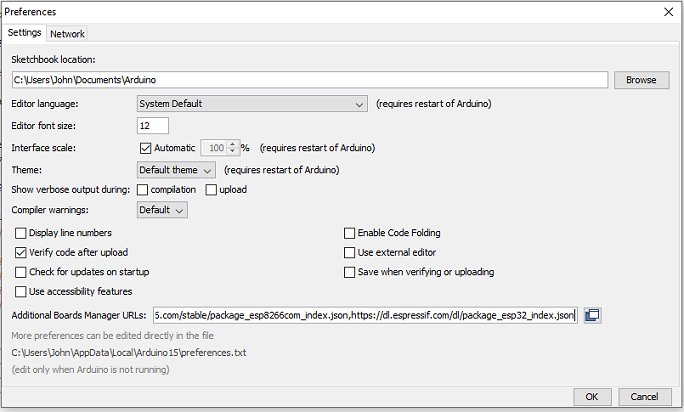 Setting up the Arduino IDEIf you haven't used the ESP32 in the Arduino environment before, it's necessary to install the ESP32 Board definitions into the Arduino IDE.In the Arduino IDE, select File -> Preferences. In the Additional Boards Manager URLs text box, enter: https://dl.espressif.com/dl/package_esp32_index.json then click the OK button. If there's already an entry in the text box, separate them with a comma (,).
