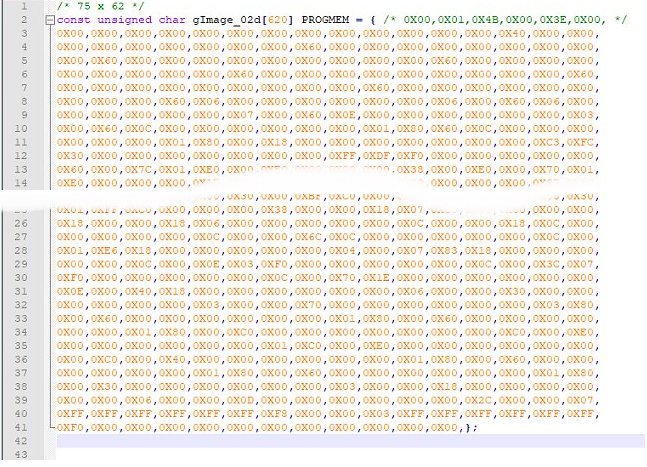 When you click the Save button, you will be asked for a filename. I used the same names as the weather icon's IDs used by OpenWeather. For example: 02d for the "Day Icon with few clouds" icon. Save the file with the .c extension. The default action of Img2Lcd is to automatically open Windows Notepad to show the file. If Notepad doesn't open, click the Set button on the Img2Lcd toolbar. I recommend that you copy the entire "char [] {}" array from Notepad, paste it into your favourite text editor and save it as a file called bitmaps.h. You can discard the Notepad version. An example is shown below. Note that Img2Lcd added "gImage_" to form the Array name. Note also the addition of PROGMEM. I added that myself to load the array into PROGMEM although there's plenty of memory available in the LOLIN D32 module so it isn't strictly necessary. Note also that I added the comment /* 75 x 62 */ directly above the Array. That's the width and height of the image as noted in Img2Lcd. We need the size when we draw the image on the e-paper display so it's worth noting down the size for future reference.