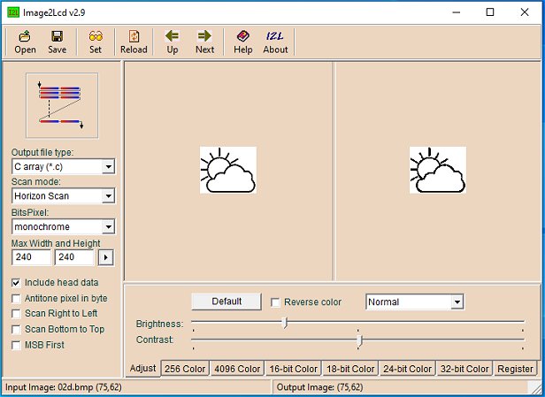 Each bitmap image now needs to be converted into a "char [] {}" array that the Graphics Library uses to draw the bitmap on the e-paper display. There are a few online tools to do the conversion but I prefer to use an application downloaded to my desktop. The one provided by Waveshare (who actually supply the e-paper display) works well. Download the zip file from https://www.waveshare.com/wiki/File:Image2Lcd.7z, extract the contents of the zip into a suitable folder and run Img2Lcd.exe. Click the Open button and open your weather icon bitmap. The settings and checkboxes shown below work fine for me. Some people need to check the Reverse color checkbox or select Mirror Left-Right from the drop-down list. There may be a bit of trial and error so use whatever produces a correct image on the e-paper display.