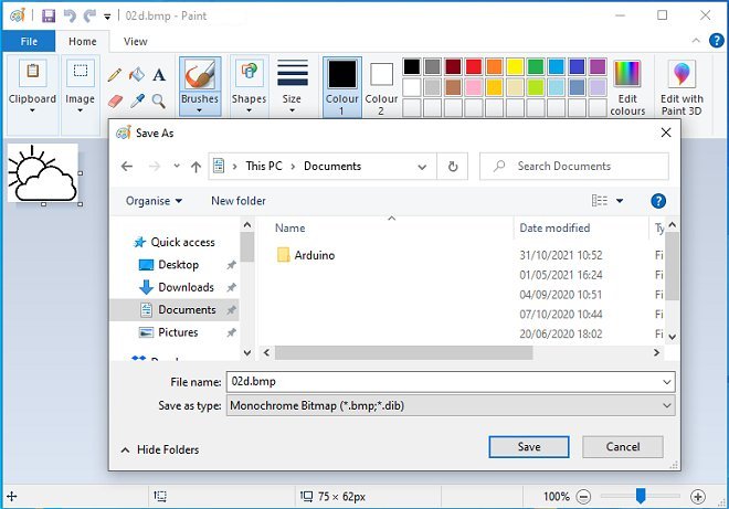 To design the icons, I used a very old version of Paintshop Pro but any paint program should do - Windows' Paint works fine. The icons' height and width can vary but keep them around 75 x 75 pixels. Crop the image tightly to avoid leaving any unnecessary "white space" around the image as it just wastes memory in the ESP32 module. Save them as Monochrome (or 1-Bit) bitmaps.