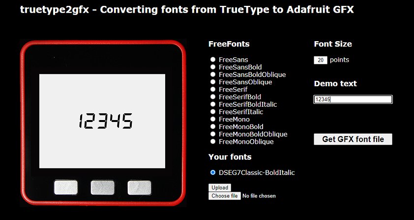 Converting a TrueType Font to an Adafruit Graphics Char ArrayObtaining suitable fonts is the first part of a two-part process. The data for each font now needs converting into an Adafruit_GFX integer array. The most straightforward way to do it is to visit https://rop.nl/truetype2gfx/.