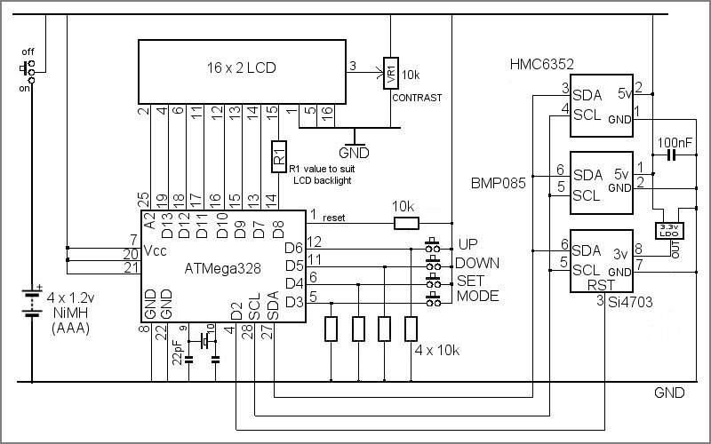 BMP085 Barometric Pressure &Temperature SensorThere are a couple of variations of breakout boards available for the BMP085. The version from Sparkfun needs a 3.3 volt supply. The version from Adafruit has an on-board 3 volt regulator so it "5 volt ready".The version I had as a spare was the Adafruit 5 volt version but, as this project requires a 3.3 volt regulator anyway (for the FM tuner), the Sparkfun version would be equally suitable (with suitable modifications to the PCB layout).