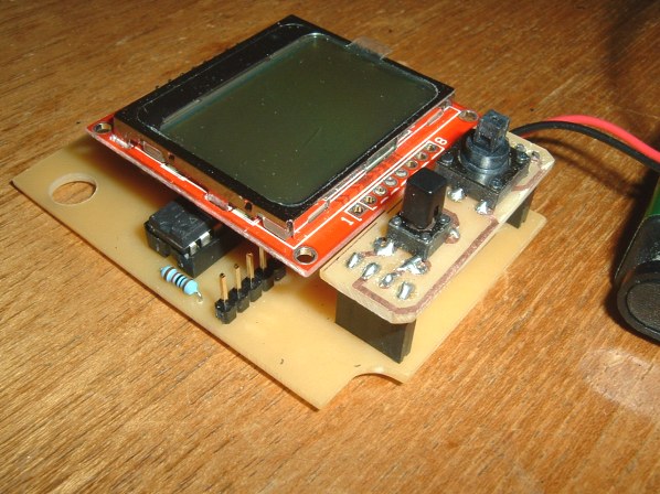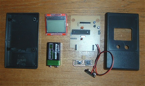 The Printed Circuit BoardThere are a few different pin arrangements on the Nokia 5110 display so the PCB may need a bit of modifying, especially the connection to the LED backlight, which requires the 560R series resistor, and the Ground. All the other pin designations (including Vcc) can be determined in the software.The main PCB and the switch panel PCB can be etched together but the switch panel needs trimming afterwards to clear the enclosure's internal plastic pillars. The PCB artwork in Circuit Wizard format can be downloaded here together with the Arduino sketch.