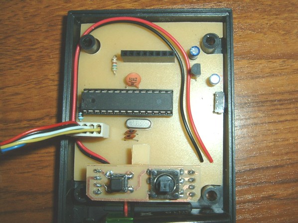 AssemblyThis photo shows the components soldered to the PCB and switch panel. Note the small 'tab' of PCB material super-glued to the underside of the switch panel to act as a support for the bottom edge of the Nokia display.Note that the switch panel is designed copper side up to allow the 4-way pin headers at each end to be inserted from underneath and soldered on the top side. There's enough of the tactile switch pins accessible on the top side to allow for soldering.