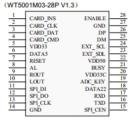 Waytronic Electronics WT5001M03-28PI've left this one until last because it's the module I've used in my Home MP3 player. It's two rows of pins are the standard 0.6" apart. Otherwise, it's specifications are very similar to the WT50001M02-28P except for the omission of the micro-SD card holder. If you look at the appropriate section of the datasheet (or the diagram below), you'll notice that the connections for the SD card are brought out to pins 1 to 5 on the module: