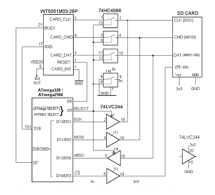 Changing BusesIt's reasonably straightforward switching the SD card from one bus to another but bear in mind, the WT5001M03-28P module uses the native SD protocol's bidirectional bus to "talk" to the SD card whereas the Arduino uses it's unidirectional SPI bus.The signals from the MP3 Module are at the correct 3v3 level which means two things: (1) The SD card must use a "bare" card-holder without any built-in level-shifting and (2) the 5 volt signals from the Arduino will need to be reduced to 3v3 before being applied to the SD card. The MP3 module thoughtfully provides a 3v3 supply for the SD card (and, in our case, for one of the CMOS ICs). Although there maybe more elegant solutions, this is how I did it: