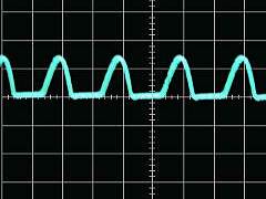 The top images show the AC voltage output using a single diode. Only half of the full AC cycle is used resulting in a very 'lumpy' DC output. OK for cheap battery chargers but a decent bench supply needs to do better. In the lower images, both halves of the AC cycle contribute to the DC output. The first, using two diodes, requires a transformer with two secondary windings which are connected in series or a secondary with a centre-tapped winding. The second uses four diodes in a bridge configuration but only requires a transformer with a single secondary winding. The output waveform is the same in both cases but the first method is more efficient in that the power dissipated by the secondary is shared between the two windings. Also, with the first method, output voltage is only lost across one diode whereas, in the bridge connection, the voltage dropped across two diodes has to be taken into account. The transformer I had intended to use provides just 12.5 volts off load and has a single winding. The AC voltage is measured as the "RMS" value and, after using a bridge rectifier, the DC voltage is closer to the "peak" value. So, after rectification, I'd expect to see about (12.5 x 1.414) - (2 x 0.7) volts DC. Just over 16 volts is comfortably above the 3 volt input-to-output differential required by the LM338 regulator for a 12 volt maximum ouput. Unfortunately, the on-load voltage is a different story...