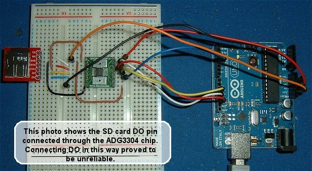 Unfortunately, my old analogue CRT oscilloscope just isn't up to the job with today's electronics so it wasn't really possible to tell but I suspect the SD card's SPI is very critical of the pulse shape and, although the ADG3304 is designed for exactly this use, mounting it on a breadboard with relatively long (6cm) connecting leads was upsetting the wave shape to the extent that using the 3 volt Data Out signal from the card directly to the MISO input on the Arduino gave much better results.