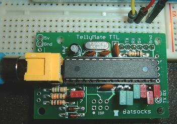 The Batsocks TellyMateThe Batsocks TellyMate is a small kit designed to take 5v TTL serial data and display it on a TV or any device with a Composite Video (AV) input.I bought the kit several months ago - before I was interested in the Arduino - so I bought the TellyMate TTL Kit rather than the version designed as an Arduino Shield. All the components required are supplied, including, of course, the pre-programmed ATmega8 chip and its 16MHz crystal. The components are all good quality and the small PCB is screen printed, double sided with through-hole plating and is of excellent quality.