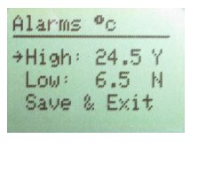 in the Setup Menu shown below.To display the Alarm Setpoints screen, the centre of the 5-way navigation switch is pushed once. The arrow at the left of the screen indicates whether the High or Low setpoint is to be adjusted. The UP and DOWN buttons on the navigation switch selects High, Low or Save & Exit. The Navigation switch's RIGHT and LEFT buttons adjust the appropriate setpoint value up and down respectively. The values change in 0.5 °C increments. PUSH the centre button on the navigation switch to toggle the setpoint alarm between Enabled (Y) and Disabled (N). When an alarm is sounding (or the screen backlight is flashing), pressing the PUSH button while the main screen is displayed will silence the alarm but an asterisk (*) will appear to the right of the Max or Min value on the main screen (to show which value has been exceeded) until the value is once again within the setpoint limits. The setpoint alarm will still be enabled so the alarm will sound again the next time the temperature goes out of bounds.