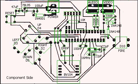 ![]() All the hardware designs based on TVout are open source and compatible with the TVout library so I decided to base a simple project on the Hackvision design. My version uses a single-sided printed circuit board because that's all I have the facilities for. As a result, it's slightly larger than the Hackvision version and doesn't have such a comprehensive set of output headers. I've had to combine the two "paddle" headers into a single 6-way header - the intention being to wire the header to two separate 4-pin case-mounted sockets when the pcb is fitted in a case. I haven't fitted a header specifically for a Wii Nunchuk controller (as in the Hackvision design) although the two analogue pins (A4 and A5) are available on a two-pin header. I decided at the outset to incorporate a USB-to-Serial converter breakout board to make it easy to re-program but my design still incorporates it's own 5 volt regulator instead of using the USB's 5 volt supply.