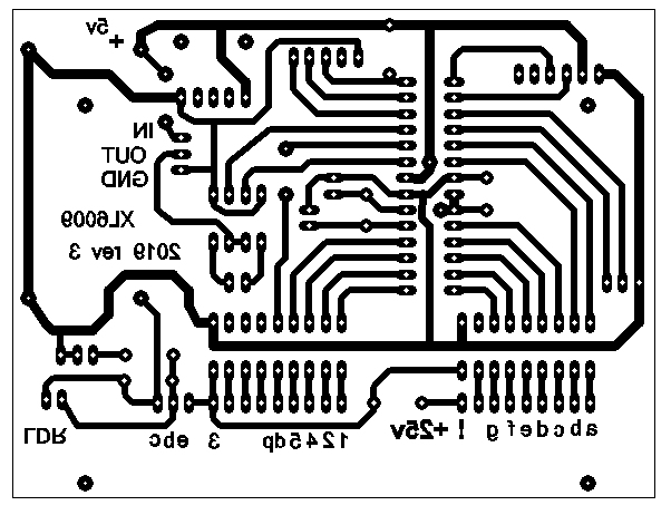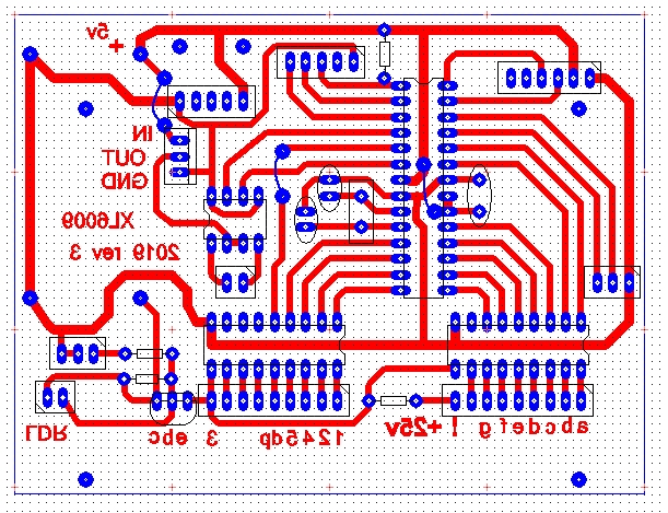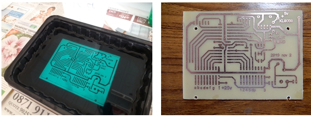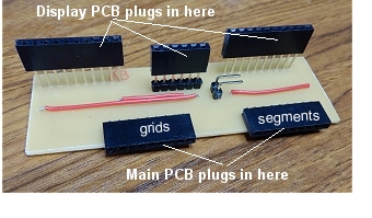 the display PCB and the main PCB, I made a "patchboard" PCB (shown left) which plugs into the display PCB and the main PCB. The patchboard allows any cross over connections to be