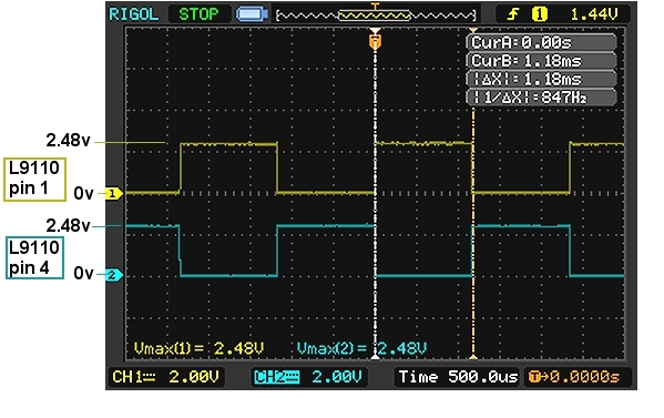 I also included a 5v to 3.3v buck regulator in the Vcc supply to the H-Bridge to ensure that the filament voltage can't exceed 3.3 volts. In fact, with a 3.3 volts supply and 5 volts applied to the inputs, each output to ground from the H-Bridge is 2.48 volts. Measuring the voltage across the filament can be confusing - even with the oscilloscope - as it will measure the peak-peak at around 5v but only half of that will be across the filament at any moment.
