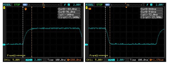The Sync/Square wave OutputThe XR-2206 provides a separate output for the sync/square wave and it's virtually a rail-to-rail output at over 20 volts. It's useful for synchronising the oscilloscope while probing a circuit with the sinewave but I also wanted to use it to drive a frequency counter. In either event a more manageable output voltage seemed sensible. R6, R7 and R8 provide an 8v peak-peak signal with about -0.1 volts below ground.This signal is fed to both halves of the comparator - LM293. The outputs at pins 1 and 7 swing between ground and 5 volts. The output on pin 7 is taken to a front panel BNC socket (for 'scope sync or other uses) and the output on pin 1 is taken to a header - together with +5v and ground - for connecting to the ATmega328-based frequency counter. The 1N4148 helps protect the ATmega328 input by removing any negative spikes that may be present on the square wave. At 590kHz, the square wave has a rise time of about 140ns and a fall time around 70ns. A faster comparater could be used if faster rise and fall times are required. However, as I've noted above, I've restricted the upper frequency limit to about 310kHz because of the square wave's instability between 23kHz and 50kHz when using the smaller timing capacitor.