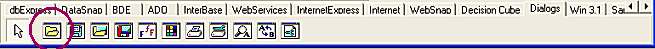 Scan along the Tabs on the Component Palette to Dialogs, select the Open Dialog (circled in the picture above) and drop one anywhere on the Form. This is another one of those invisible components (like the Main Menu component) so it doesn't matter where it goes. In the Object Inspector, change its Name to OpenDialog. Back in the Code Window, add the following code: