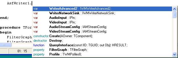 If we use Delphi's Code Insight, we can examine the properties, functions and interfaces of the AsfWriter...