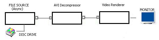 A complete collection of filters such as this is known as a Filter Graph and applications build them to suit their particular requirements by using a DirectShow Object called the Filter Graph Manager - or, more correctly, the application creates an instance of the Filter Graph Manager and then uses it to create the Filter Graph. The Filter Graph Manager can be used to add filters individually to a Filter Graph but the Filter Graph Manager contains logic called Intelligent Connect which can be used to allow it to search your computer's registry for suitable filters and connect them automatically. This is a very powerful feature because it allows an application's functionality to "grow" if a user should add more filters. For example, many third-party applications - such a WinAmp etc - will add filters of their own and list them in the registry. Provided a filter has been written to the DirectShow specification, it's use may be enlisted in any other application in which DirectShow's Intelligent Connect feels it would be useful. The Filter Graph Manager's Intelligent Connect is invoked by calling its Render or RenderFile method. Consider the simple video file player shown on the previous page. Its Filter Graph might look something like this: