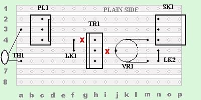 Solder each component in turn. I suggest the following order: LK1, LK2, SK1, VR1,PL1, TR1, TH1. Soldering in this order