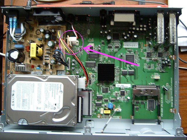 | Overall view inside the Humax showing the location of the fan connector and the new circuit board. Note the unshielded power supply board immediately to the left.
