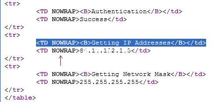 Note the IPOffset=8 entry in the example above. This is to allow for non-printable characters, such as linefeeds and returns. The aim is to make RouterStats start looking for the IP address itself somehwere where I've drawn the arrow in the image above - which, in this case - is roughly 8 chararacters after the highlighted text if you include one return and one linefeed. It doesn't need to be exact; the address will be extracted automatically provided there are no other numeric characters or the full stop (.) between the arrow and the address itself.