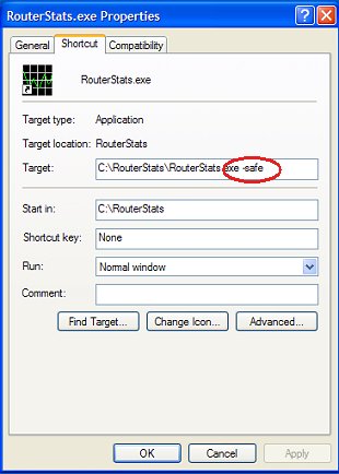 RouterStats. Right click on the RouterStats shortcut and select 'properties'. Temporarily add (space) -safe to the Shortcut Target.