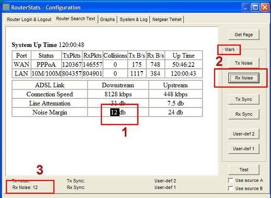 Find where it is displayed in the window and highlight the figure (1). Press the Rx Noise button (2) in order to mark its position. Its value should appear next to the 'Rx Noise' text below the window (3).