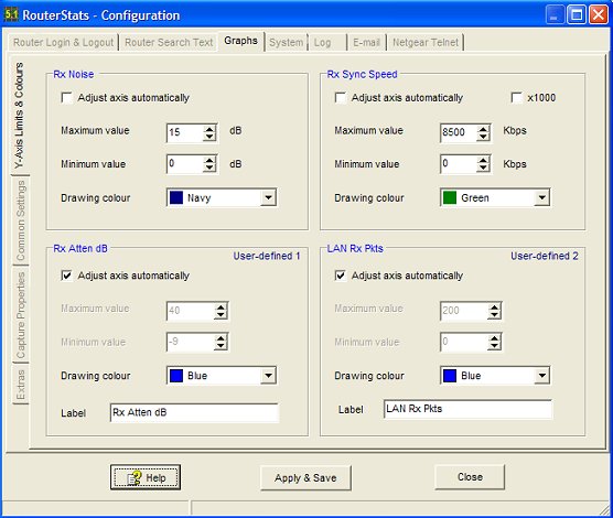 Here you can set the maximum and minimum values for the vertical (Y) axis of the Rx Noise, Rx Sync Speed and the two user-defined graphs. Alternatively, they can be configured to adjust automatically by checking the appropriate Adjust axis automatically checkbox.