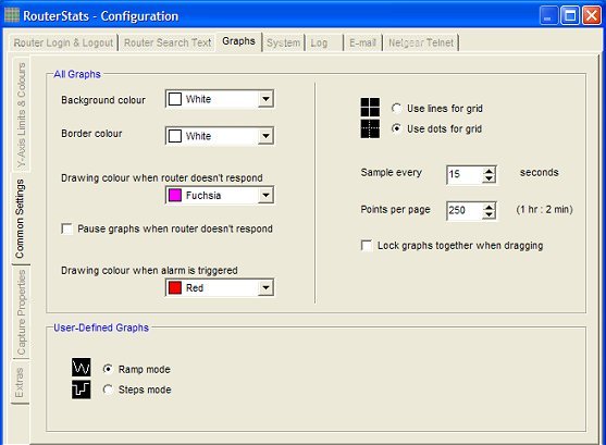 You can select a different line-drawing colour when the router doesn't respond - or you can check the Pause graphs when router doesn't respond checkbox - and you can select a drawing colour for when an alarm has been triggered.