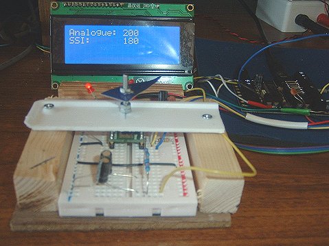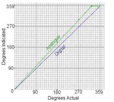 Analogue & SSI ComparedThe AS5040 is extremely sensitive to variations in the magnetic field as the magnet is rotated above it. To give a fair trial to both analogue and SSI readings, I had to hold the breadboard in place with a small wooden jig with a "bridge" over the centre of the chip so that the magnet could be rotated accurately and smoothly. I'm currently designing/building the mechanical housing for an AS5040 project so will be able to provide more accurate angular readings then.The correlation between the actual angle turned and the displayed value is critically dependent on the positioning of the magnet above the chip. To all intents and purposes, the SSI output closely followed the actual angle turned. The analogue values showed increasing error as the angle increased. The error is consistent, though, so it should be easy to add in a factor (except for the "dead spot" after 330 degrees). Other factors, such as the distance between the AS5040 and the Picaxe would obviously affect the accuracy of the analogue signal - depending where the RC filter circuit is located.