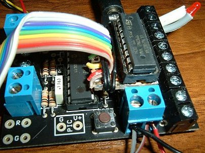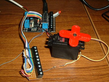 Cut another strip of Veroboard, 18 copper strips x about 7 holes and solder a 9-way terminal block (8 outputs and 0v) along one edge. Join the two boards together with a short length of ribbon cable. On the "socket board", I just soldered the wires to the copper without threading them through the holes otherwise there's a risk of the wires touching the pins on the 18M2 PICAXE chip below. I tied the cable down to both pieces of Veroboard to reduce the strain on the solder connections. Remove the ULN2803 from the 18M2 Project Board and insert it into our new socket. Insert our board into the vacated socket with the ribbon cable on the side closest to the PICAXE chip. Job done! The photo below shows an LED being switched from the ULN2803 (output B.7 and +5v) and the pulse input of a servo being controlled directly from the PICAXE (output B.0 and 0v).