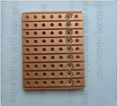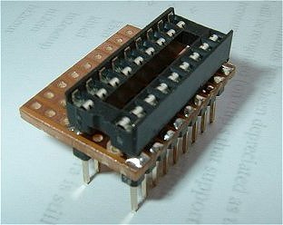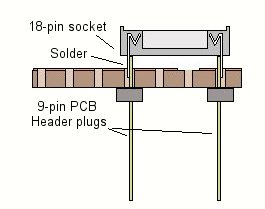 Cut a piece of veroboard, 9 copper strips x 7 holes and cut the tracks as shown in the left photo. In my enthusiasm to see if the idea would work, I ruined my first attempt because I forgot to cut the tracks. As the board is soldered copper side up, it's impossible to cut the tracks once the socket is in place! The holes in the Veroboard are easily big enough for the header pin (from below) and the IC socket pin (from above). It's a bit fiddly to assemble but, once the header pins and socket are in place, the socket sits on top of the header pins and leaves about a 0.5mm gap between the top (copper) side of the board and the underside of the socket. Just enough space to get a small soldering iron tip in and solder the socket and the header to the copper strip at each hole.