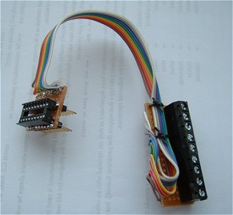 Note: the latest 18-pin project boards have PCB pads brought out between the Picaxe and the Darlington chip so this modification will no longer be necessary. CHI030A. Despite having an interest in electronics since I was about 10 years of age, I've only recently become aware of a "spin-off" from the PICmicro® microcontroller ICs. I'd looked at those several years ago but had never really found the time to devote to what seemed like quite an intensive learning curve. I'd programmed 2708 EPROMS (a massive 1KB x 8-bit) in the past but the idea of separate programming hardware for PICmicro chips somewhow seemed a retrograde step. What I didn't know, until recently, is that someone else must have thought the same! PICAXE® microcontroller ICs start life as conventional PICmicro microcontroller ICs but the manufacturer has pre-programmed them with "bootstrap" firmware which allows them to be programmed in situ (without removing them from the final circuit board) using nothing more than a 3.5mm stereo socket, a couple of resistors and some free programming/editing software. To gain some experience with these chips, I bought an 18M2 Starter Pack. Basically, the pack includes everything you need to get started, including a compact printed circuit board holding the 18M2 chip and a ULN2803 - 8 Darlington drivers in a single IC. The ULN2803 "protects" the PICAXE chip's outputs and allows it to switch more current. Although useful, the ULN2803 can occasionally get in the way because sometimes direct access to the PICAXE's outputs is required - for example, when driving a radio control servo or using a pin for serial output. Although a dedicated circuit board would probably be built for final projects, it's useful to test parts of the final project using the board supplied with the starter pack. One solution is to remove the ULN2803 and replace it with a simple DIL header. A 16-pin one is all that's required because pins 9 and 10 are the chip's supply and wouldn't be used. Fortunately, the ULN2803's pinout is such that opposite pins on the header can simply be strapped across with a piece of wire - or a 330 ohm resistor - except pins 9 and 10, which are 0v and +5v. I wanted the option to have outputs direct from the PICAXE chip or from the ULN2803 and devised a simple "breakout board" which provides 8 outputs and 0v directly from the PICAXE. (To be strictly accurate, they're picked up from the inputs to the ULN2830). The existing 8 outputs from the ULN2803 are unaffected although it's probably not a good idea to use any particular output twice. I'm sure a suitable long-legged IC socket is available for this modification but it would have been a case of trial and error. With postal deliveries delayed due to the holiday season and bad weather, I wanted to press ahead with parts I already had in my bits box.