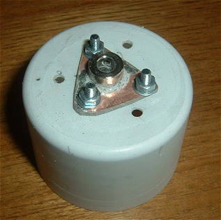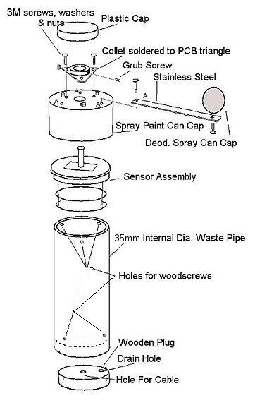 ![]() ![]() The 12mm marine ply disc is a "snug" fit inside the PVC pipe and the stainless steel disc sits on top of the end of the pipe. The shielded bearing is super-glued to the stainless steel disc in addition to being held down firmly with the stainless retaining plate. The wooden plug at the bottom end of the pipe is positioned so that there is a 5mm 'lip' at the end of the pipe so that rain running down the outside will drip off. The rotating hub is a cap from a can of spray paint and sits over the PVC pipe. There's about 1.5mm clearance all round between the cap and the pipe - plenty of clearance to apply a layer of self-amalgamating tape over the top edge of the pipe to seal the joint between the pipe and the "sensor assembly".